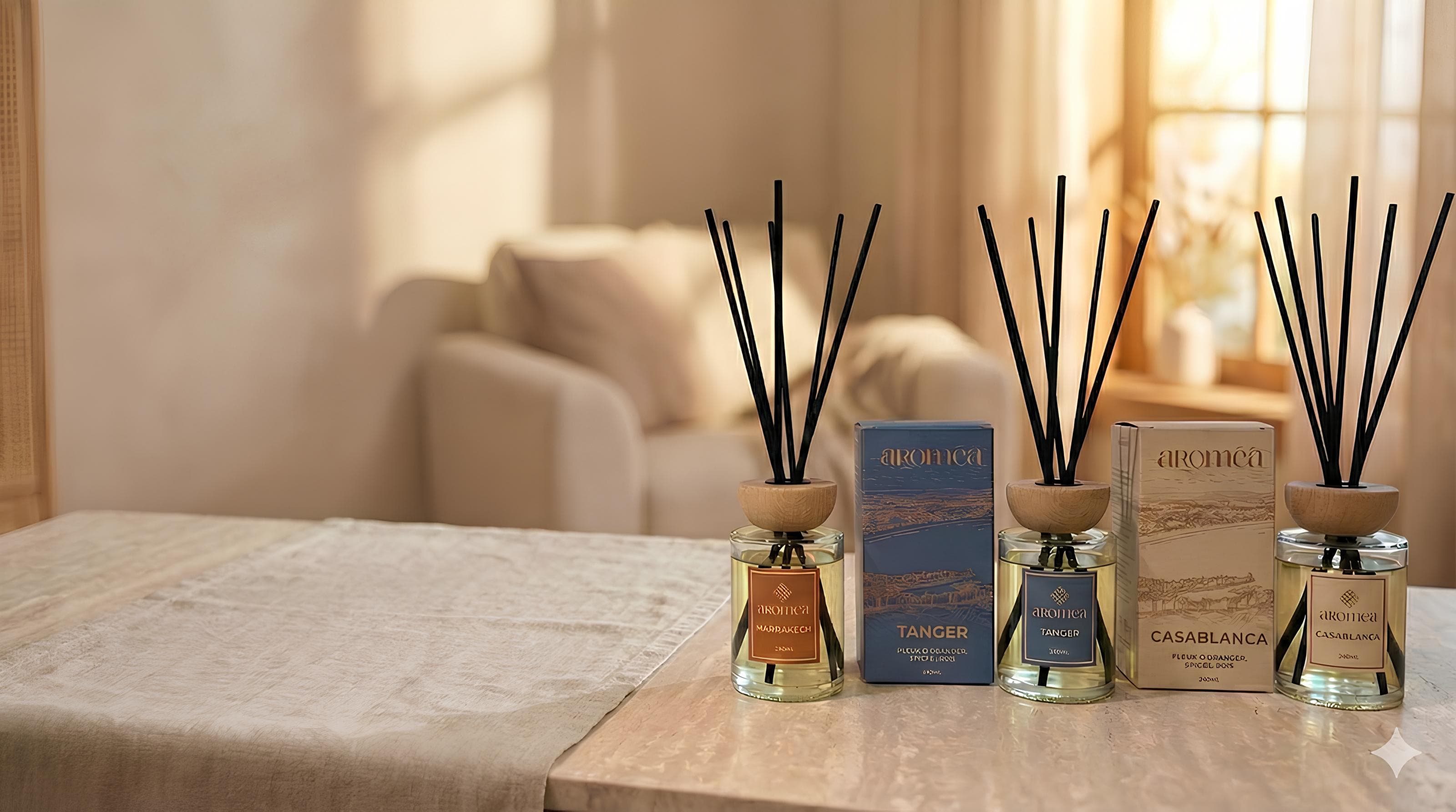 Découvrez le diffuseur AROMEA Marrakech, une fragrance qui évoque les épices envoûtantes du souk et les notes chaudes du jasmin et du musc.